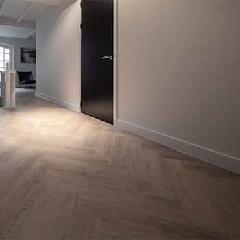 Op de foto zie je een voorbeeld van de pvc-vloer Belakos Palazzo XL 72 Visgraat langs een rechte muur. Zie je hoe kort de planken zijn gesneden langs de muur?